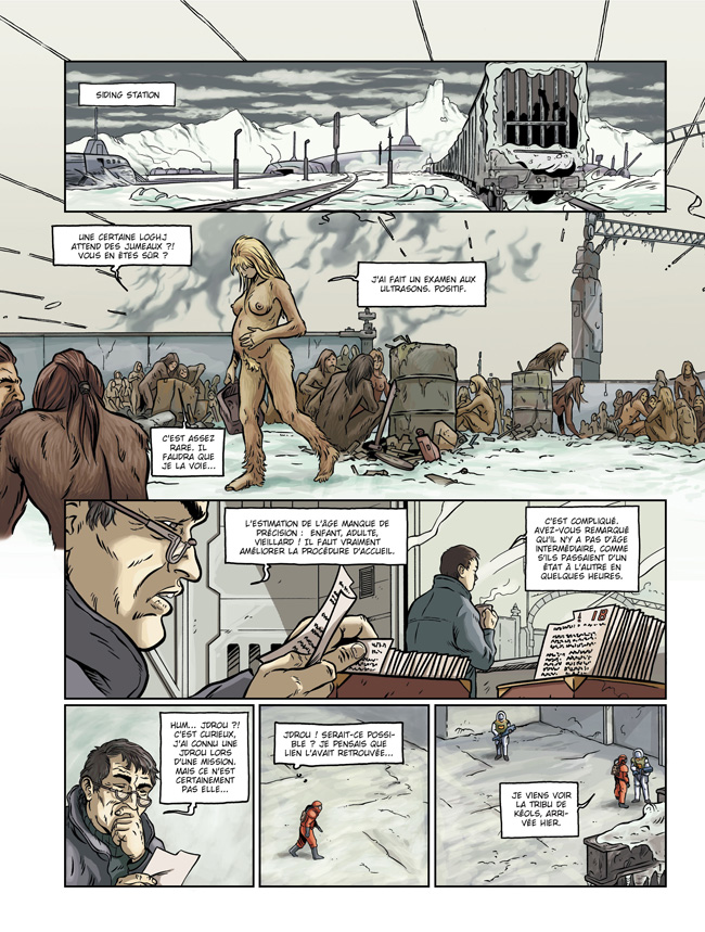 Harl Mern, ethnologue est officiellement chargé d’étudier les Roux. Les autorités se sont aperçues que ceux-ci étaient indispensables pour toutes sortes de missions dont la plus importante consiste à enlever la glace qui recouvre les dômes. Les Roux sont donc amenés dans des cages pour être parqués avant d’être répartis pour différentes tâches. Consultant ses fiches, Harl tombe sur un nom qui lui rappelle quelque chose… Jdrou ! Il enfile sa combinaison thermique et se précipite là où les Roux sont détenus…