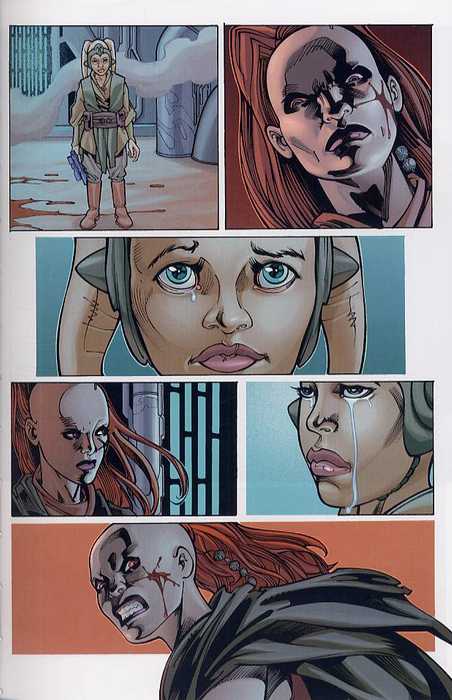 La première histoire, quant à elle, développe une double mission confiée à Aurra Sing par deux Quarrens expatriés de leur planète Mon Calamari pour différents trafics. Elle devra assurer leur vengeance envers l'un des leurs mais également tuer un chevalier Jedi, la femme sombre. Cette tâche prend une tournure plus personnelle car Sing, en d'autres temps, fut sa padawan. Tout ce beau monde va se retrouver sur la planète-sanctuaire de la Jedi pour un ultime règlement de compte, mais il faudra aussi compter avec Ki-Adi-Mundi venu arrêter la fameuse chasseuse de primes. Le récit de Timothy Truman est parfaitement construit, avec une intrigue bien rythmée. Le dessin de Davidé Fabbri se veut simple, clair et limpide sans fioritures ni effets inutiles avec un trait en rondeur. Le travail sur les personnages est remarquable, tant dans leurs expressions que dans leurs représentations. L'ensemble est très cohérent et du coup très agréable à lire.