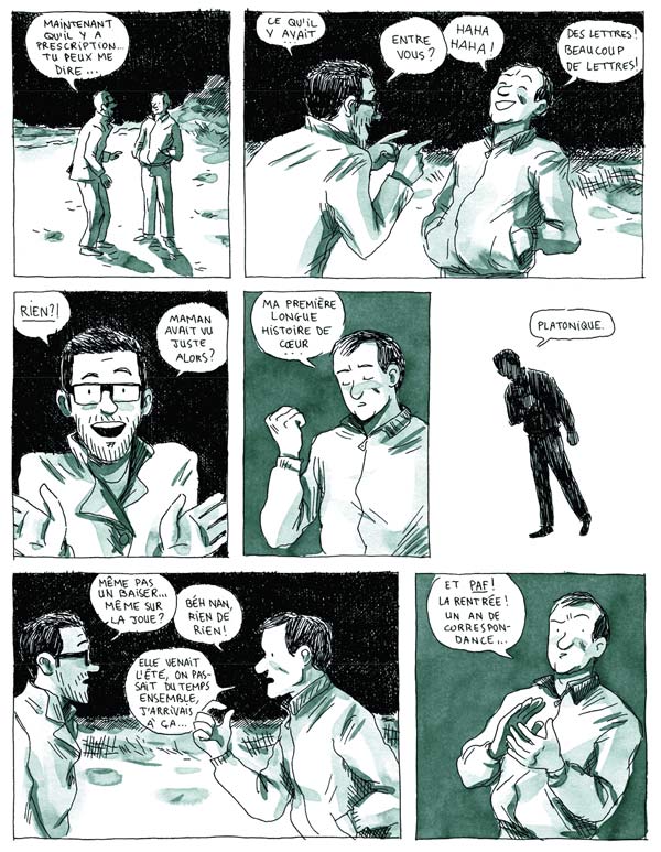 Quand j'ai commencé à lire cette bd, je me suis dis que je devais certainement l'avoir déjà lue. Il s'agit d'un couple avec deux enfants qui part passer des vacances estivales au bord de mer chez les parents où ils sont rejoints par le frère et sa famille. Bref, c'est une scène tellement commune et universelle. Il n'y a pas réellement d'originalité dans le traitement. C'est bien la vie de tous les jours qui est analysée au peigne fin.