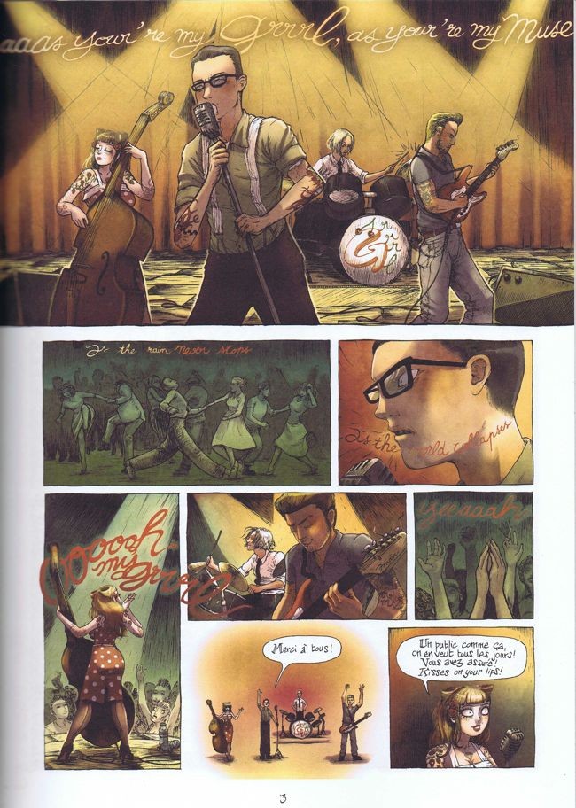Bien sûr le scénario n'a rien de révolutionnaire: on suit le quotidien d'une bande de potes réunis autour de leur passion du rock et qui montent un groupe, espérant un jour percer dans le milieu de la musique. Répètes, petits boulots galères à côté, concerts dans des petits festivals, espoir de se faire repérer par des producteurs de maison de disques indépendantes, etc. Alors c'est sûr c'est classique, ça manque même un peu de punch (un comble pour un album "rock n' roll"), oui mais voilà, on accroche car on s'attache vite aux personnages, notamment Violette, la pulpeuse et fragile héroïne de cet album.