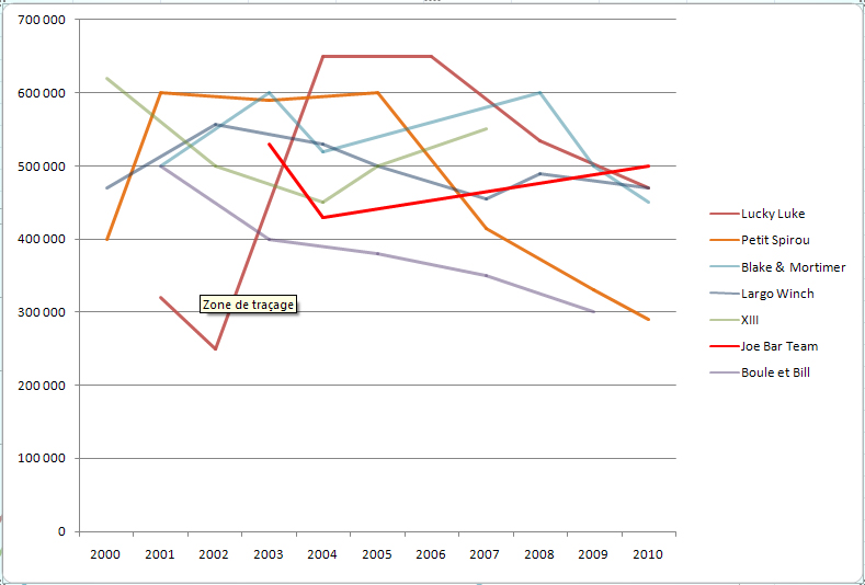 Après j'ai mis l'évolution de Blueberry. Avec une érosion qu'on peut qualifier de normale, voir même de faible si on considère la longeur de la série, jusqu’au décès de Charlier. Après, sur le cycle Mister Blueberry la série perd presque autant de lecteurs en seulement 5 albums que sur les 25 précédents.