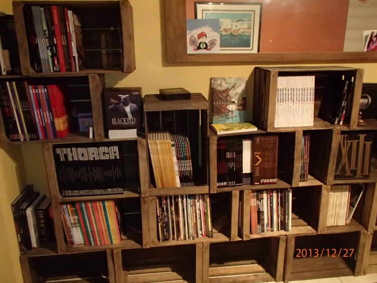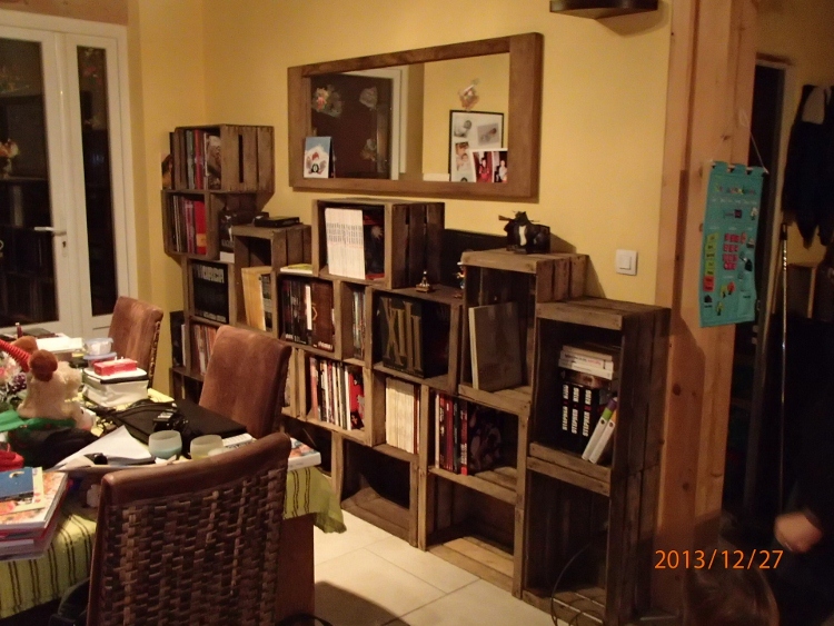 Pour ta deuxième remarque, c'est "volontaire" ... même les caisses vides sans les BDs avaient déjà cet effet... car toutes les caisses ne sont pas forcément identiques (il peut y avoir une différence d'environ 1 cm sur les mesures...), et je ne me suis pas pris la tête à toutes les trier .. comme par hasard, première rangée du bas j'ai une caisse plus grande d'1 cm par rapport aux autres ... étant donné qu'au dessus c'est en quinconce, le décalage est déjà créé ... je l'ai laissé car j'ai trouvé ça sympa à l'oeil. Le jour où je devrais en rajouter, j'irai même jusqu'à en mettre position losange. Aprés, dès que tu les fixes entre elles, plus rien ne bouge.
