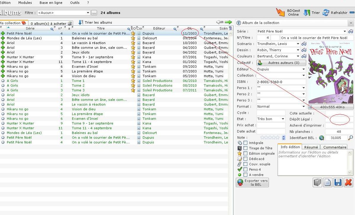En gros j'aimerais savoir si c'est possible de faire en sorte que l'information sur le dépôt légal sur la gauche se retrouve dans la case de droite, de sorte que je puisse avoir des vrais stats sur l'âge de ma collection (jusqu'à maintenant le module statistiques ne prend en compte que les albums que j'ai pu ajouter manuellement après mon importation)