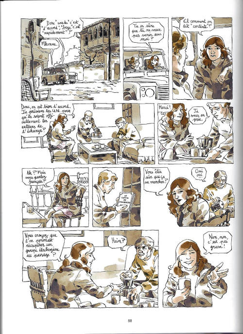 L'héroïne incarne parfaitement cette volonté. Presque insouciante face au danger, comme le soir de son arrivée, faisant la fête et dansant, elle n'en demeure pas moins impliquée et obstinée. Gérer ses stocks, les surveiller, négocier avec la pègre locale pour éviter les pillages ou obtenir quelques avantages en troquant ce qui peut l'être l'accaparent totalement. Son implication dans sa tâche humanitaire trouvera un moteur grâce à sa participation au premier convoi vers Gorazde. Elle découvre alors que, même dans cette situation, au milieu des décombres, en manque d'électricité, d'eau, de nourriture, l'art peut aussi aider à tenir. Par petites touches, la scénariste glisse des détails de la vie quotidienne qui rendent saisissant le décalage entre la situation et la manière d'y faire face. En décrivant les destins des personnages secondaires, elle parvient à faire toucher du doigt aux lecteurs l'absurdité de ces frontières et de ces guerres. Parfois chaotique, l'enchaînement des événements dont Isabelle sera témoin en quelques mois reste lisible grâce à un découpage sobre et efficace. Malgré certains protagonistes pas toujours identifiables au premier regard, ce qui nuit à la fluidité tout en renforçant l'impression de confusion ambiante, l'essentiel demeure : l'atmosphère oppressante et terrifiante et, au milieu, un espoir.