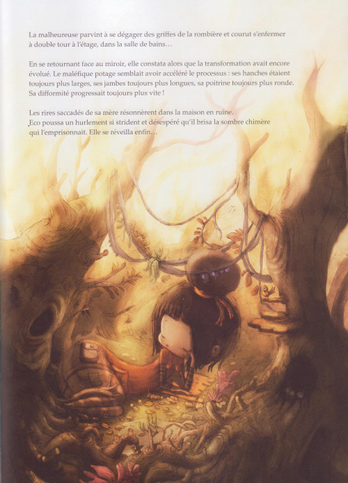 La présente version comporte l’intégralité des trois tomes de la série. Cela est fortement plaisant, car une fois ce récit commencé, il est impossible de le lâcher. Guillaume Bianco s’amuse des codes des contes et de leur noirceur. Son découpage scénaristique est ainsi fait, que le lecteur suit la chute d’Eco, puis son cheminement dans le temps. Le récit est profond. La conception du temps et son rôle dans l’histoire sont habilement menés jusqu’à la fin. Les lecteurs y verront aussi une ode subtile au corps féminin, à sa transformation et à son acceptation, à travers le traitement du personnage principal. Ces thèmes sont admirablement servis par les magnifiques traits et couleurs de Jérémie Almanza. Il est difficile de ne pas tomber sous le charme des dessins et de la frimousse des personnages. Le tout donnant une ambiance graphique réunissant celles de Tim Burton et de Neil Gaiman. Quel tour de force !