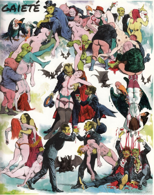 Pourtant, ces bouffonneries délirantes et malsaines ne doivent pas être prises au premier degré. Fidèle à lui-même, Buzzelli, tel un satyre satiriste, ne fait qu'exacerber les travers de son époque (pas si éloignée de la nôtre) pour dénoncer l'Humanité pour ce qu'elle est : une vaste foire d'empoigne où tous les coups sont permis. Les classes sociales se mélangent comme l'ivraie et la mauvaise graine. Tous égaux devant le vice. Et l'ensemble parfaitement emballé dans un dessin impeccable parce que, malgré le rythme de stakhanoviste qu'il s'imposait, le dessinateur ne bâclait jamais. La rapidité d'exécution combinée avec la virtuosité du maestro offre un cocktail détonant.