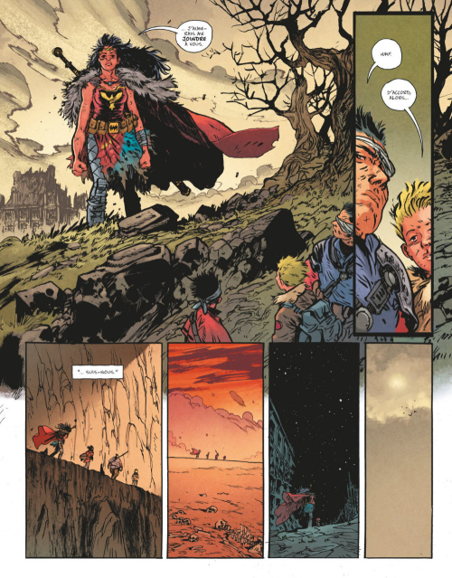 La relecture de Wonder Woman ne manque pas d'audace. Loin de rester dans ses petits souliers, au risque de se mettre à dos toute une communauté, Daniel Warren Johnson va jusqu'au bout de ses idées et de la nouvelle donne qu'il offre au personnage. L'influence d'Hubbard et de son Conan n'est jamais loin, surtout dans les deux premiers chapitres, mais aussi dans le dessin. Ne serait-ce que celui qui orne la couverture de l'album. Diana est vêtue d'une large peau de bête, les bras reposant sur le pommeau d'une large épée. Loin d'être glamour, son regard est sombre, limite vide, son nez est écrasé et son corps est maculé de sang. Le ton est donné, le récit va être violent ! L'héroïne devient, à son corps défendant, le seul rempart pour guider une communauté humaine vers la liberté, tout en cherchant à comprendre ce qui a pu se passer avant sa cryogénisation. Au fur et à mesure de l'aventure, son passé lui revient et va lui causer un énorme choc, tout comme au lecteur lorsqu'il lira ce qu'a réellement été le "Grand Feu". L'idée est carrément dingue mais géniale, la prise de risque est payante. Bien que post-apocalyptique, le récit ne s'éloigne pas vraiment des valeurs de la série, telles que son créateur d’origine William Moulton Martson les a voulues. Wonder Woman donne la part belle à la force des femmes, sans verser dans le wokisme bien-pensant, à leur aspiration, leur désir et leur volonté. De plus, il est aussi question de pouvoir et de la manière de le contrôler, ce que Diana apprendra avec effroi. En somme, le récit est plus complexe qu'il n'y paraît, ce qui est très satisfaisant.
