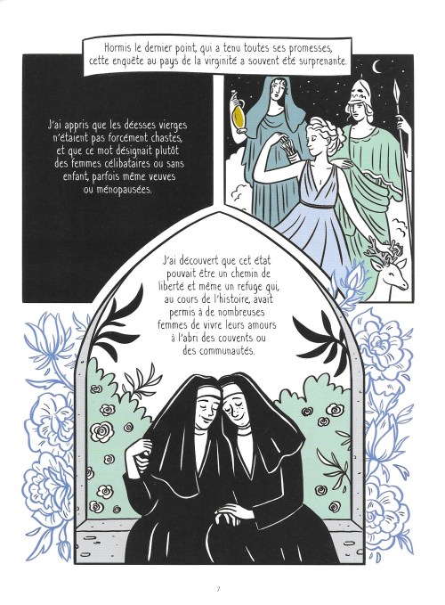 ierges - La folle histoire de la virginité s’ouvre sur un récit autobiographique. Élise, la narratrice, remonte le cours des années et fixe les moments auxquels elle fut confrontée à un concept inconnu, celui de la virginité. Celui-ci s’appliquant aussi bien à une terre, un signe astrologique, à l’huile d’olive ou à une personne n’ayant jamais eu de relations sexuelles, il suscite plus d’interrogations que d’éclaircissements. Et quid de Jeanne la Pucelle, de la Sainte Vierge, avec des majuscules ? Dans ce brouillard sémantique, l’enfant perçoit que la chasteté peut incarner un refuge, une liberté ou un asservissement. Surgit inévitablement la double prise de conscience des jeunes filles qu’elles sont vierges et qu’un jour elles ne le seront plus. Commence alors le chemin de croix de l’adolescente, bien décidée à perdre un jour cette innocence, afin d’éviter moqueries et humiliations, parcours pavé de termes épars et de pratiques nouvelles : premiers baisers, caresses, masturbation, orgasme, règles, tampons. L’esprit et l’affect assaillis par ces scories résument le tout par la peur et la conviction que cette perte qui semble inévitable se tient bien loin du plaisir.