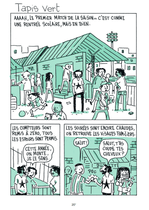 a bande dessinée ne nourrissant pas toujours son homme, pour vivre, Lénaïc Vilain a tâté du gardiennage de nuit (RAS), du service de sécurité (Sécurité Open your bag) et de l’économie 2.0 (Dans la boîte). Entre deux contrats, il en a même profité pour voyager (Bons baisers d’Iran). Cependant, côté divertissement, sa grande passion est le football et, plus précisément, le Red Star, un des clubs professionnels de la capitale française. Logiquement, il a décidé d’en faire le sujet d’un album mêlant documentaire et autobiographie : Tribune(s) – Chroniques de gradins.