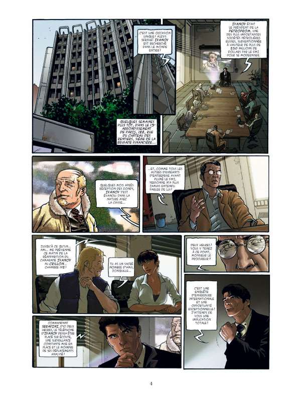 A la lecture de Section Financière, on pense inévitablement à une série comme I.R.$ . En effet, les deux séries sont très proches, nous plongeant toutes deux dans les arcanes du monde de la finance. Pourtant le parallèle s’arrête là, le scénario de Malka (L'Ordre de Cicéron ) se différencie par le choix de la Brigade Financière à Paris comme théatre des opérations. De son côté, le dessin de Mutti (Brumes Hurlantes , Break Point) n’est pas comparable à celui de Vrancken et lui préfère un registre encore plus réaliste. Richard Malka, avocat de profession, aborde ici le thème des aides financières internationales accordées à la Russie et les réseaux de corruption mis en place pour détourner ces fonds. Il nous offre un scénario palpitant et bien construit. Il a su privilégier une narration efficace en évitant, par déformation professionnelle, d’alourdir son récit de principes juridiques à longueur de pages. Que ce soit clair, il s’agit d’une fiction et à ce titre les enquêtes de ces hommes et femmes sont bien plus mouvementées et plus dangereuses que dans la réalité. Il n’aurait pas fallu en faire plus, au risque de sombrer dans un récit complètement surréaliste.