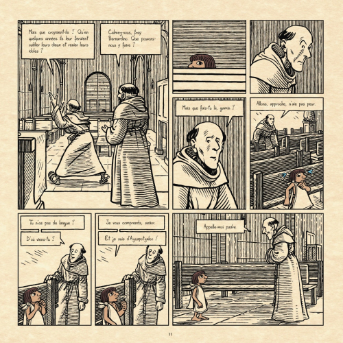 Auteur inclassable se renouvelant à chaque nouvelle BD, Jean Dytar s’est associé à l’historien Romain Bertrand pour raconter cet épisode peu connu de la conquête espagnole. Évidemment, narrer frontalement et classiquement cette anecdote qui se déploie sur des décennies aurait été trop simpliste ou limitatif pour le dessinateur du Sourire des marionnettes et des Illuminés. À la place, il a tissé un récit multi-focal, mêlant roman d’apprentissage et de compagnonnage, anthropologie et fable universelle. De plus, il évite soigneusement d’occulter la complexité et la dureté des enjeux en place (génocide culturel, colonisation, sources historiques orientées, etc.) grâce à un scénario qui prend le temps d'aborder les différents points de vue d’une manière à la fois complète, sensible et accessible. Si Bernardino est à l’origine de ces péripéties savantes, c’est bien Antonio qui concentre les attentions dans son rôle de passeur. Sa maîtrise du latin, du castillan et du nahuatl lui permet de comprendre l’évolution des situations, de s’y perdre parfois, tout en servant de guide au lecteur au long de cet ouvrage aussi foisonnant que généreux.
