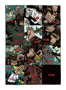 Récit choral à la limite des genres, Thrillerville est le premier scénario de Lerenard. Quelque part entre les frères Cohen et Guillaume Griffon, il anime une distribution haute en couleurs dans une sorte de course à l’échalote multicéphale particulièrement truculente. Des flics de campagne bourrus aux jeunes femmes dynamiques, en passant par l’épicière hors d’âge, sans oublier une ou deux créatures légendaires et, évidemment, quelques secrets passés et présents qui ressurgissent, les stéréotypes ne manquent pas. Heureusement, le néo-scénariste ne s’est pas limité aux apparences et au pastiche. Intercalés dans la trame principale, des retours en arrière très bien construits apportent précision et contexte aux différentes force en présence. Ces petites touches enrichissent la psychologie des personnages et amènent de nouvelles pistes ou significations aux événements. L’ensemble est emballé par un humour omniprésent et essaimé de références et clins d’œil «pop-culturesques» savoureux. Il en résulte un album tonique, un peu longuet peut-être, mais toujours fluide et bourré d’une énergie contagieuse.