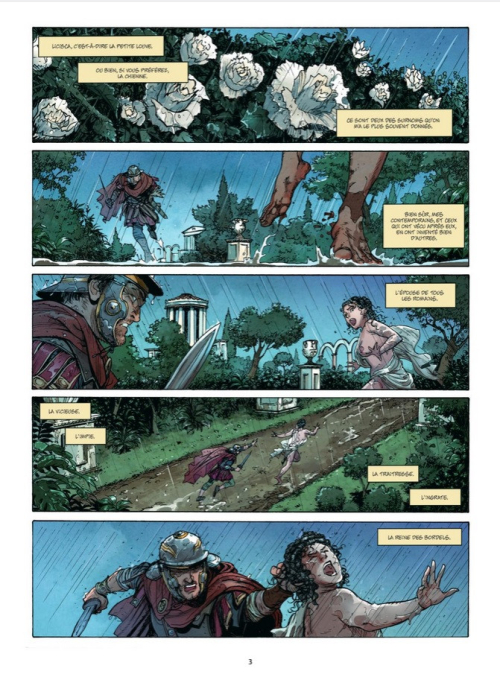 Nouvelle venue parmi les Reines de sang, Messaline prend place auprès d’Agrippine (pour laquelle deux albums sur trois sont déjà parus) et précède Poppée (dont l’histoire paraîtra en 2026). Luca Blengino (Les trois Julia, Les sept merveilles, R.U.S.T.) officie aux scénarios mettant en scène ce trio. Ici, secondé au dessin par Antonio Sarchione et aux couleurs par Axel Gonzalbo, il frappe fort dès les premières pages : l’ouverture, parfaitement maîtrisée, est immédiatement prenante et plonge le lecteur dans l’ambiance. Un long flashback s’ensuit, lequel permet d’en apprendre davantage sur l’héroïne, contextualise les événements marquants de son existence, révèle son caractère ainsi que le panier de crabes dans lequel elle évolue. Le portrait brossé dans La déesse des miroirs montre une femme ambitieuse, imbue de sa propre beauté et décidée à l’utiliser comme moyen pour obtenir ce qu’elle souhaite. Pour autant, celle que l’histoire a retenue comme étant une dépravée cruelle et que les Romains ont frappée de damnatio memoriæ (vouant son nom à l’oubli) apparaît également comme une amoureuse éperdue et aveuglée, que ses appétits rendent manipulable. De fait, les complots et intrigues fleurissent dans le cercle impérial et Messaline a aussi bien été l’instigatrice de certains que la victime d’autres.