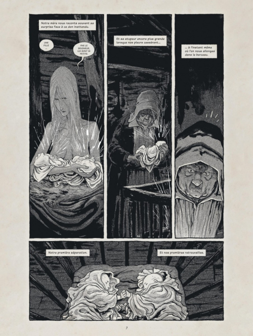 Mais il est temps de parler d’Édouard Cour ! Pour illustrer ce conte, à la fois sombre et lumineux, il a réalisé une partition graphique en tous points exceptionnelle. Ouvrez cet album et feuilletez-en quelques pages pour en être convaincu. Chaque planche est un monde. Avec une maitrise parfaite, il compose un dessin délicat, fourmillant de détails, texturé par une trame très fine qui donne une profondeur incroyable à ses décors. Ses nuances de gris, notamment, sont d’une grande complexité et luisent d’une inquiétante lueur gothique. Associé à un noir et blanc qui joue souvent d’un clair-obscur expressionniste, l’ensemble est d’une beauté à couper le souffle.