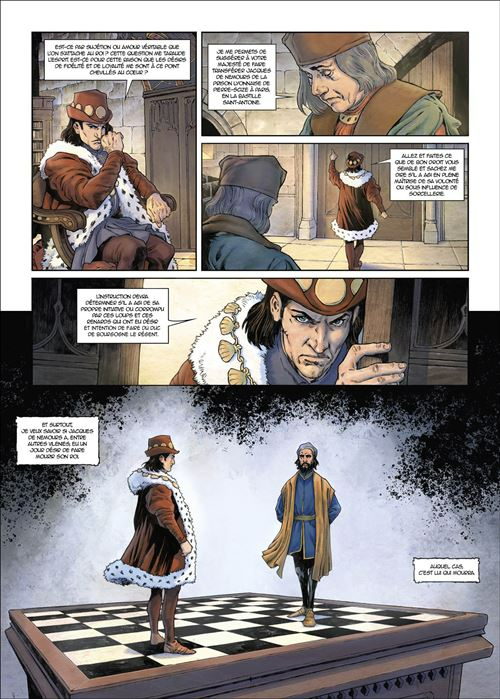 Débutant avec l’annonce de la capitulation de Jacques d’Armagnac, duc de Nemours, ancien favori devenu adversaire, le récit navigue entre l’instruction du procès contre ce dernier et plusieurs flashbacks visant à éclairer sa relation avec Louis XI et à déterminer les motivations de sa trahison, mais aussi depuis combien de temps le traitre aurait mené un double jeu. Les années d’une amitié née à la fin de l’enfance balaient ainsi une succession de moments importants et mettent en avant le regard que le noble déchu porte sur son souverain, ses actions et ses choix, ainsi que sur l’évolution du royaume de France et des rapports avec les autres puissances. Ce choix scénaristique assure une bonne dynamique et permet de casser la linéarité, parfois pesante, d’une biographie classique. Toutefois, malgré des dialogues et explications fournis éclairant plutôt bien les enjeux, il est dommage que certains aspects restent rapidement effleurés ou que le portrait de certains acteurs-clés, à l'instar de Charles le Téméraire, souffre d'un traitement un brin caricatural. Finalement, l’équilibre délicat du lien entre les deux hommes au centre de cet album trouve son point d’orgue dans une ultime partie d’échecs en tête-à-tête durant laquelle chacun peut exprimer le fond de son cœur.