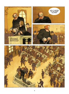 Jolan Thomas a choisi un western comme cadre de son premier album. Le genre est éprouvé, éternellement à la mode et souvent réinventé. Des bandits, une attaque de train qui dérape, le procès et la corde, pas vraiment de surprise. Pour donner un peu de chair à ce programme notablement balisé, le néo-auteur a tenté d’insuffler un peu de profondeur à ses personnages et en appelle à la clémence du jury. Des hors-la-loi, ça ne fait aucun doute, mais sont-ils si différents de tout un chacun ? Comment traitez-vous cette terre qui vous nourrit ? Et quel sort avez-vous réservé à ceux qui l’habitaient avant votre arrivée ? Ça change un peu la donne, n’est-ce pas ? Pas du tout, la loi est la loi, il faut la respecter. La fable est simple, peut-être un peu trop malheureusement. En effet, malgré une construction narrative efficace, le scénario du Procès des affamés laisse le lecteur un peu sur sa faim. S’il est impossible de ne pas adhérer au propos, c’est aussi parce que celui-ci s’avère passablement consensuel, voire pauvret dans son développement.
