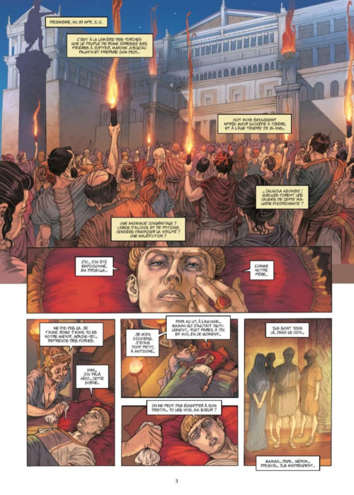 Second volet de la trilogie consacrée par Luca Blengino à la mère de Néron, Le théâtre des fous poursuit immédiatement les événements du Sang céleste. Quoiqu’éloignée de la cour impériale, l’héroïne n’en reste pas moins très au courant de ce qui s’y trame grâce à ses nombreux contacts et amitiés plus ou moins intéressées. Narratrice, elle raconte la dizaine d’années qui s’écoulent entre la mystérieuse maladie d’un Caligula qu’elle décrit comme fou, sanguinaire et incestueux – forçant le trait dans sa haine et biaisant le décès brutal de Drusilla - et sa propre union avec leur oncle Claude. Toujours selon une trame chronologique, le récit alterne d’abord entre les divers retournements de situation à Rome, et les échos qu’en reçoit Agrippine dans sa ville puis en exil. Surtout, il montre une femme de poigne, habile à survivre et à s’entourer, d’une volonté inébranlable et au caractère passionné ; mieux, elle sait prendre le meilleur de ceux qui la soutiennent, sans s’inquiéter de les sacrifier à ses desseins. Graphiquement, Roberto Ali et Angelo Iozza livrent une copie certes honorable, mais pas palpitante. Les artistes s’attachent à restituer le cadre antique et la composition des planches offre des perspectives variées. Cependant, il est dommage que, par moments, le rendu de certaines expressions du visage paraisse grossier ou moins réussi.