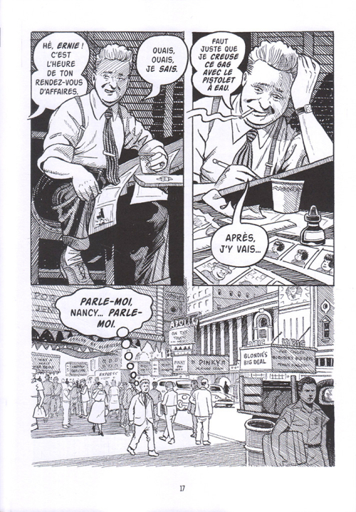 Auteur peu connu de ce côté de l’Atlantique, Ernest Bushmiller (1905 – 1982) jouit pourtant d’une aura certaine aux USA. Nancy, son héroïne la plus célèbre, qu’il anima pendant près de cinquante ans est devenue et est encore aujourd’hui considérée comme une icône. Pourquoi ce strip, identique à des milliers d’autres, est-il passé à la postérité ? Comment travaillait et qui était cet artiste stakhanoviste ? Bill Griffith (Zippy the Pinhead), lui-même une légende de la BD US, propose un biopic analytique sur les pas du papa de Nancy.