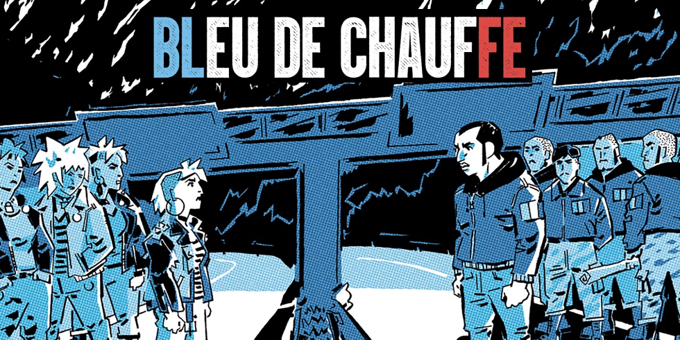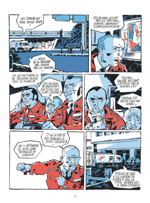 L’illustration de ces vies, heurtées par la violence physique et sociale, est cohérente avec le propos. Via un trait anguleux, le dessin est comme taillé au couteau. Il met l’accent sur la colère, la pauvreté, le sang et la drogue. Les aplats de couleur en bleu, blanc, rouge apportent également cet aspect très tranché, sans pour autant tomber dans la caricature du drapeau national. En effet, l’auteur échappe à la facilité d’un rouge pour la gauche et d’un bleu pour la droite, mais souligne les moments de violence, de tension, de choix d’un côté, l’abattement, l’attente, la décision froide de l’autre.