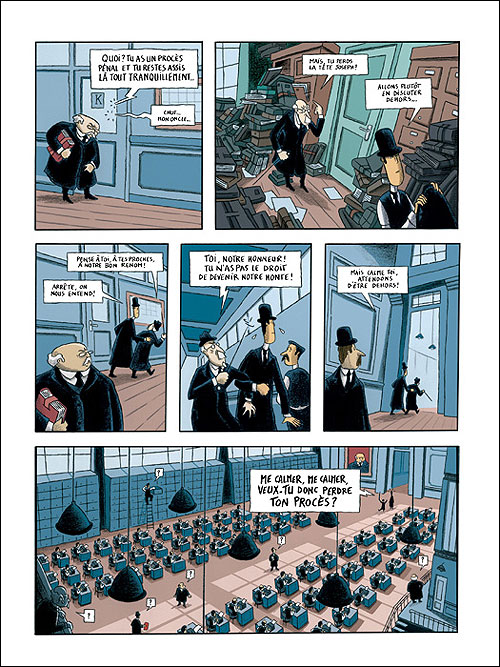 Grand créateur d'ambiances où l'humour noir le dispute à l'oppression d'une bureaucratie absurde, Franz Kafka est apprécié des auteurs de bande dessinée. Soit parce qu'ils s'en inspirent, comme Marc-Antoine Mathieu avec Julius Corentin Acquefacques (Kafka à l'envers), soit parce qu'ils décident plus prosaïquement d'adapter une de ses œuvres en bande dessinée. Après Le Château par Olivier Deprez (en gravure sur bois !) et La métamorphose par Peter Kuper, voici une adaptation par Clod et Ceka du roman le plus connu de l'écrivain pragois : Le procès.
