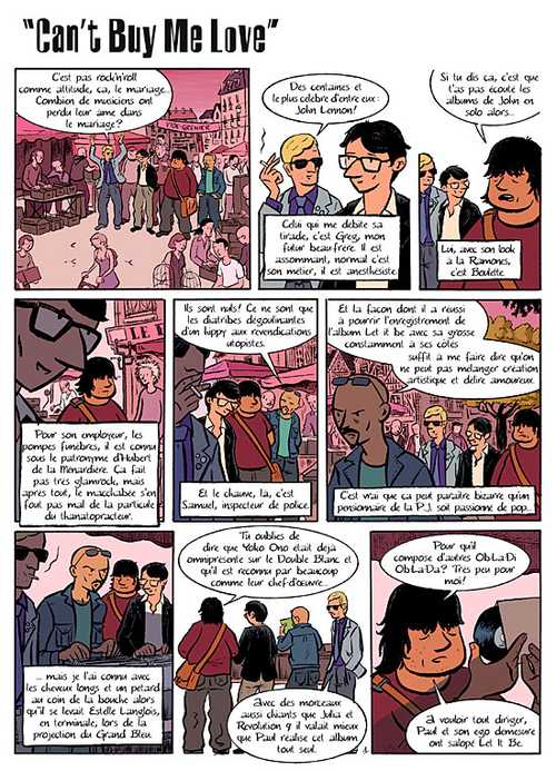 Pour ce premier volet du quadruple album Love song, à la lumière d’une pochette euh... d’une couverture aussi réussie qu’évocatrice, on pouvait craindre une compilation de petites scènes réunies dans un cadre empesé pour illustrer des chansons des Quatre de Liverpool. Il n’en est rien, ou presque. Les titres sont là surtout comme un fond sonore cher à l’auteur plus que comme le livret d’une comédie musicale. Là ce sont les Beatles, suivront les Stones, les Who et les Kinks. L’essentiel n’est pas l’hommage du fan mais ces trentenaires et plus particulièrement l’un d’entre eux qui sera au centre de chaque album.
