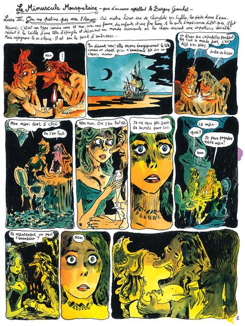 e troisième tome du Minuscule Mousquetaire ressemble si peu aux deux précédents qu’on peut se demander s’il s’agit bien de la même série ! Certes, le héros est toujours Nicolas Savinien Restif de la Gascogne (également nommé Borgne Gauchet, voire Petrus Barbygère dans des destins parallèles), fine lame, beau parleur et mousquetaire devenu minuscule en buvant une potion amincissante. Mais c'en est fini de la Petite France, ce royaume infime aux mœurs libertines gouverné par des femmes, que le personnage parcourait avec jouissance depuis deux livres. Voici le mousquetaire en pleine mer, à bord du navire du capitaine Scorpione. Comment il est arrivé là, mystère. Et qu’allait-il faire sur cette galère ? Eh bien... courtiser la femme du capitaine, bien sûr ! S'ensuit une odyssée remplie de naufrages, duels, rencontres et séparations.