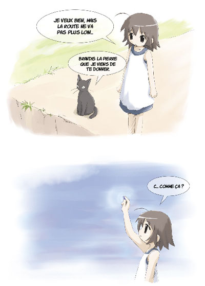 n ciel aux couleurs étranges, un chien malicieux qui parle, un arbre qui court, et voilà que Lucy pénètre dans le ventre d’un chat. Une averse, un matou gris, une drôle de route, l’autre fillette se rappellera-t-elle de son ami d’un moment ? L’été, l’amitié et la pierre bleue qui lit Shimashima à Miyako auront-elles raison de la maladie ?