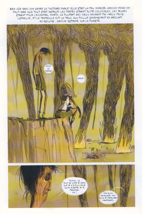 Ah la belle tranche de délire ! Vous voulez une bataille avec des extra-terrestres qui charcle, qui dépouille, qui ensanglante protagonistes et décors ? OK, en 25 pages, pas une de plus, le monde est sauvé. En ruine soit, les survivants sont en piteux état et l’air y est nauséabond mais il est sauvé. Place à la reconstruction et à la Paix sur Terre. L’occasion de souffler, de ronronner ? Pensez-vous, après le mariage de la carpe réactionnaire et de la (chaude) lapine révolutionnaire, place aux complots, aux viles machinations et aux ambitions pour le bien du plus petit nombre. Sept en l’occurrence. Mal assortis, nombre de crétins notables dans le lot, sûrs de leur fait et surtout de leurs fins. De quoi en tirer une allégorie sur le pouvoir, la situation à l'époque de l’après-guerre, le sort réservé au Général, les technocrates et autres drogués du sondage et des techniques mercatiques ? Vous devez vous tromper de crémerie, on n’est pas là pour ça. Rosalinde est aussi bornée que ses idéaux sont has been, et Muchu remarquable de clairvoyance par instants que futile et inconséquente dans la minute qui suit.