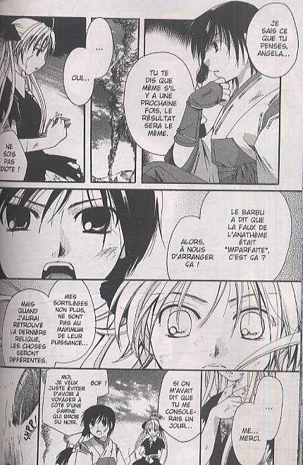 Danzaisha, Tetragrammaton Labyrinth mélange allégrement ésotérisme, magie et combats en les saupoudrant d'un léger vernis historique par l'intervention de personnages qui ont existé. Le tout pour un résultat très relatif, car le principe initial n’a rien de très original et parce que l’intrigue ne déchaîne pas l’enthousiasme. Un duo de combattantes pleines de mystères, accompagné de deux faire-valoir intervenant très peu dans ce quatrième tome affrontent des monstres de tous acabits ainsi qu’un criminel patenté dont l’infamie notoire est cependant largement édulcorée. L’apparition du fameux Gilles de Rais, préparée et attendue puisqu’il motive la haine et le désir de vengeance d’Angela, s’avère assez poussive et la confrontation qui s’ensuit entre lui et l’enfant qu’il a abusée et tuée, se révèle clairement déséquilibrée, en atténuant de fait l’intérêt. Ce dernier est relancé par l’arrivée de deux nouveaux protagonistes peu ordinaires, Gertrude et Trude. Mais le caractère en apparence placide de la première révèle rapidement son véritable fond aux accents sadiques. L’auteur se complaît d’ailleurs à la montrer dans ce rôle qui tranche avec son allure bien sage, de même qu’il multiplie les scènes d’action gores. Le dessin de Itô Ei fait écho à ce parti-pris : les bras tranchés et les jets de sang ne le cèdent qu’aux poitrines généreuses et aux longues gambettes dénudées sous des jupes volantes, quand les lèvres charnues ne se courbent pas en sourires pernicieux. Par ailleurs, reprenant largement les poncifs graphiques du genre, le trait pâtit de quelques grossières erreurs de perspective qui dénotent dans un ensemble de facture honorable.