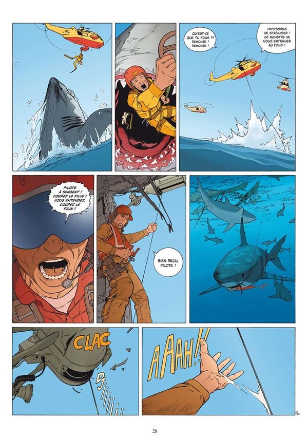 Peu importe la narration et le scénario en fait, du moment qu'on a de belles planches sur lesquelles figurent des spécimen de mégalodon. Là où je trouve qu'ils en font trop, c'est dans l'apparition inopportune de nouvelles créatures. Soit pour le mégalodon, mais faire apparaitre des bêtes venues du Jurassique supérieur comme le liopleurodon dans le 1er album ou le kronosaurus dans le 2ème, voilà qui ne rajoute pas au vraisemblable.