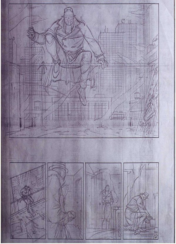 En plus de sa boîte à souvenirs, il ouvre également ses cartons à dessins. Une âme de véritable conservateur de musée cet homme-là ! Des premiers crobards exécutés par les deux compères (sur le sofa, vous suivez ?) en croquis détaillés, en passant par les recherches sur les personnages, les crayonnés, et même les études concernant les tâches de Rorsach, il y a de quoi sustenter les plus affamés des curieux, amateurs de making-of. Il livre également nombre de scans de notes manuscrites d’Alan Moore accompagnant les scripts, qu’elles servent à les commenter ou même à s’excuser d’avoir livré son travail en retard. Le coloriste, John Higgins, qui a largement contribué à l’identité de la série, n’est pas oublié. Alors, un livre-somme en tout point exhaustif ? Pas totalement puisque Gibbons confesse passer sous silences les tensions et autres moments difficiles qui ont accompagné l’aventure Watchmen. Cela, il le met de côté, avec un peu de matériel qui pour le moment restera inédit mais jure qu’il s’agit d’un choix et non le résultat d’une pression éditoriale qui aurait poussé à faire des coupes.