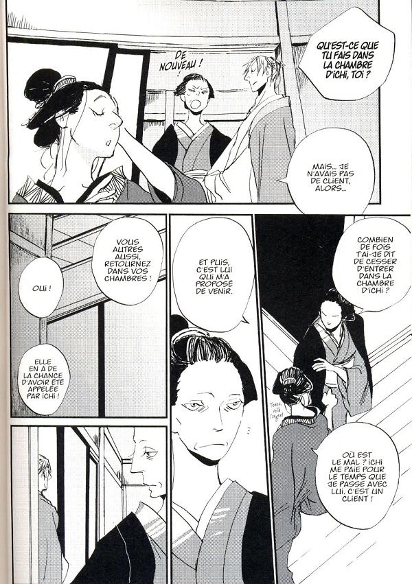 ngagé comme garde du corps par une maison de courtisanes, sur la recommandation de Yaichi, Masanosube s’étiole petit à petit, victime du « mal d’Edo ». Ne pouvant retourner dans sa province d’origine, il est envoyé chez l’Ermite, un ancien du gang de l’Araignée. Là, grassement nourri, il reprend des forces. L’arrivée d’un certain Senkichi, ex-crocheteur de la bande du vieil homme, que fait chanter un autre membre, incline Ume à quelques confidences sur son passé…