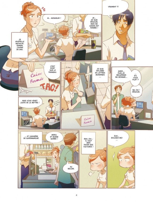 bientôt 25 ans, caissière dans un supermarché pour gagner de quoi manger et payer son loyer, Mathilde s’interroge sur son avenir et sur ces études qui auraient dû lui permettre d’avoir une bonne place. Elle cherche aussi à concrétiser son rêve : devenir écrivain, mais voilà déjà un moment qu’elle planche sans succès sur son manuscrit. Et puis ses amours avec Julien, graphiste en devenir, qu’elle connaît depuis le lycée, ne sont pas au beau fixe. Surtout depuis qu’il passe presque tout son temps avec son équipe et Judith, cette amie pour laquelle il a déjà eu un faible. Tout semble vouloir lui échapper des mains. Pourtant, la solution est peut-être là, toute proche, incarnée par ce client un peu bizarre rencontré à la caisse…