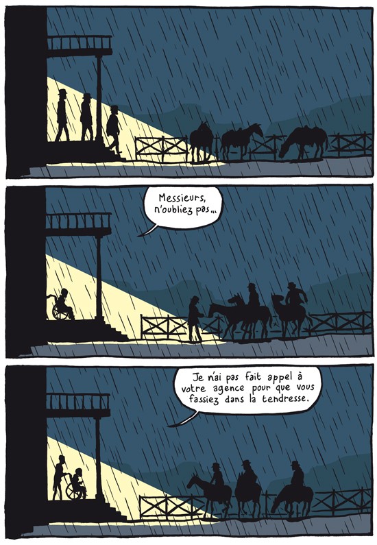 Mais cette dernière n’est que prétexte, et n’est pratiquement là que pour donner corps à l’idée que ce qui compte réside dans la manière de la conter, d’aller au-delà du fil conducteur. Cela tient à la trempe des personnages, importante dans le contexte rugueux d’une espèce de Klondike enneigé, à son heure de gloire : celle de la ruée vers l’or. Là-dessus, pas d’erreur de casting : chaque protagoniste est campé de manière efficace et avec la dose de folklore nécessaire afin de tenir son rôle comme il convient. L’auteur parvient à saisir et à mettre en exergue ces petits riens qui font mouche, c’est là que réside une bonne portion de son habilité : se concentrer sur l’anodin essentiel. Comme pour le reste, les dialogues sont bien sentis, limités au nécessaire : les bons mots ! Tout cela avec une constante justesse de ton, faite de subtilités fort amusantes et redondantes (dans le bon sens du terme, comme une prédisposition pour le « running gag ») qui devraient permettre une lecture avec un sourire amusé au coin des lèvres de bout en bout.