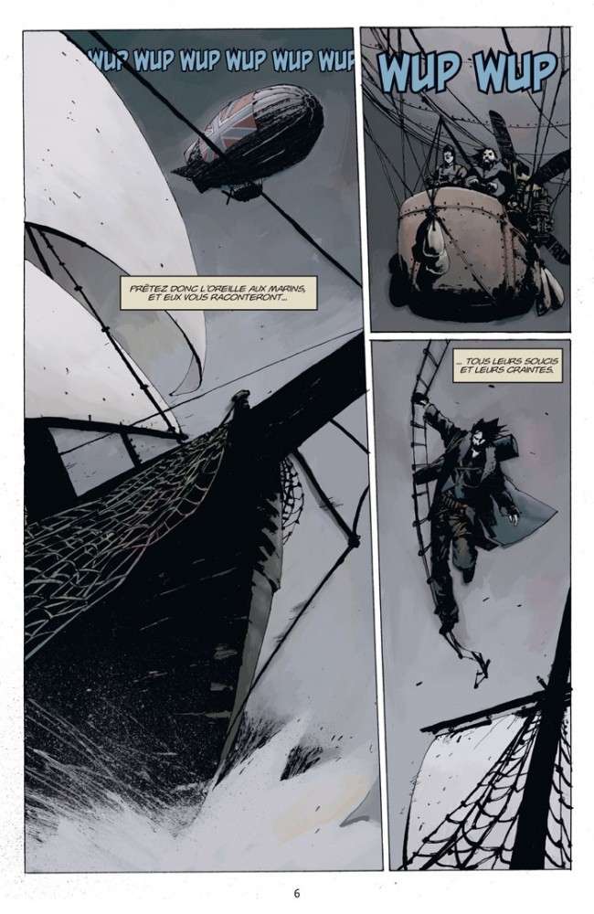 Scénarisé par Mike Mignola, tous les codes de l’univers d’Hellboy sont logiquement présents : un mystère à élucider, une ambiance sombre, un personnage taciturne et une intrigue ancrée dans le réel qui mêle un brin d’Histoire, de religion et beaucoup de fantastique. A la différence d’Hellboy, Abe n’est cependant pas du genre à faire dans l’humour et garde son sérieux tout du long. Envoyé à Saint-Sébastien, un ile française fictive, il fait rapidement la connaissance des calmars et murènes, d’une sorcière et d’autres moines démoniaques. Comme souvent dans cet univers, le personnage principal n’est pas acteur de son histoire, on découvre la nature du mystère à l’œuvre en même temps que lui et Abe se contente de réagir aux interactions dont il est témoin.