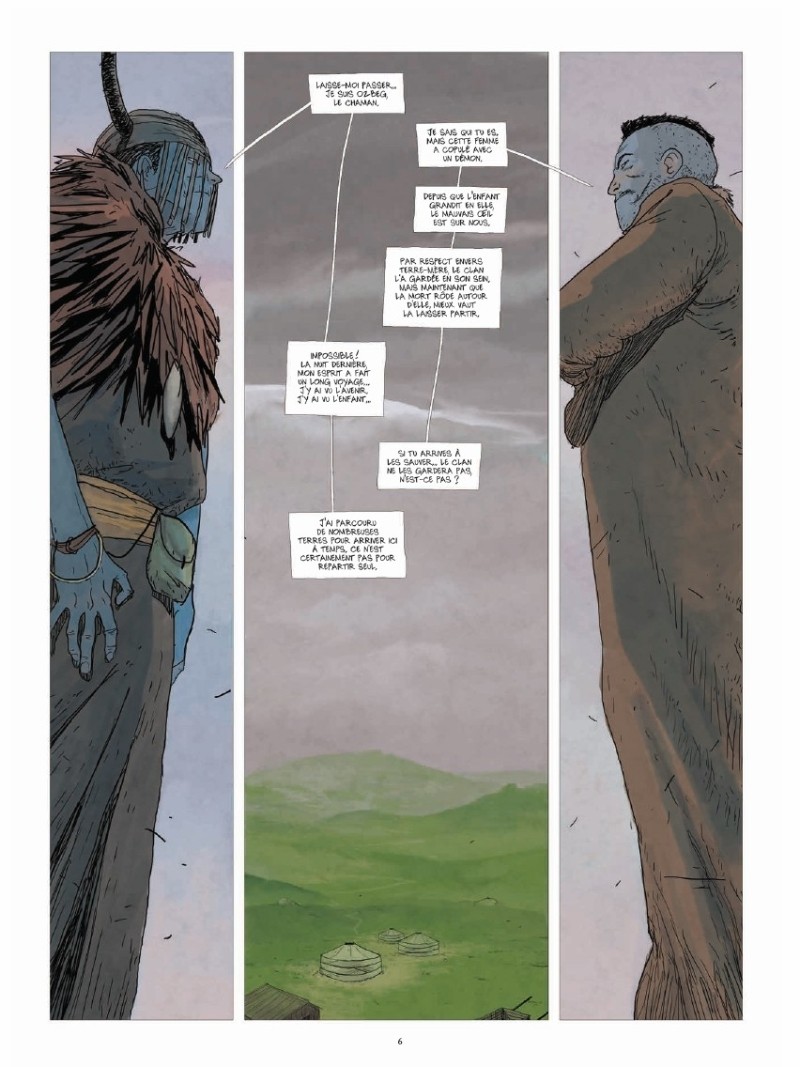 Happant dès la première page, la narration s’avère bien rythmée, malgré une ou deux transitions moins convaincantes. Elle accélère ou ralentit au gré des événements, passe de la réalité tangible, terriblement humaine, à l’univers insaisissable et reposant dans lequel l’Ayami – esprit de la Terre-Mère – reçoit, conseille et soulage le héros. Entremêlés dans l’intrigue, les deux espaces se superposent également dans le texte, puisqu’aux échanges entre Temudjin et son mentor Ozbeg succèdent ceux, mentaux, entre le jeune homme et sa maîtresse, sa mystagogue. Ponctuant l’histoire, les mythes fondateurs mongols, d’abord racontés par le chaman puis par son protégé, renforcent le caractère cyclique s’inscrivant en filigrane du propos, tout en participant pleinement à l’élaboration de la légende à laquelle le lecteur assiste : celle du futur khan. Parallèlement, le scénariste laisse planer l’idée que le chemin de ce dernier aurait pu être tout autre, s’il avait suivi une inclinaison divergente, une infime variante. Suivant cette logique, l’album s’achève sur un commencement et se prolonge dans un cahier qui, tout en apportant une réponse faite d’évidence, maintien ouvert le champ des possibles.