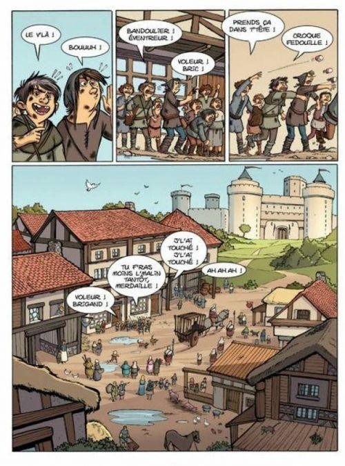 Christophe Cazenove, le spécialiste des séries "gag" chez Bamboo, se lance dans une histoire longue s’adressant à un jeune public. Ce premier tome est une réelle réussite. Le scénariste, avec un fond d’humour très agréable, bâtit un petit monde attrayant. Les protagonistes sont bien campés et les enfants n’auront aucun mal à les identifier et les situer. L’aventure mélange intelligemment action (avec la rébellion du suzerain légitime contre l’ignoble usurpateur), quête personnelle originale (accéder à la lecture) et mystère à travers l’énigmatique missive remise par la non moins impénétrable muette, Sallertaine. Les thématiques sont nombreuses – l’amitié, le don de soi, la perte d’un être cher, la prise en main de sa destinée – et parfaitement gérées. Au dessin, Cécile livre une partition des plus agréables. Cet univers médiéval est joliment constitué. Les planches sont pleines d’humour et de tendresse et les personnages expressifs et attachants (enfin, ceux qui doivent l’être).