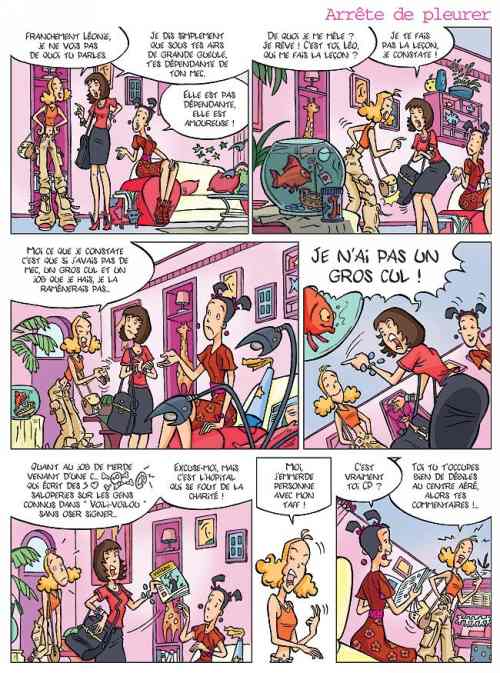 Le principal problème, c’est qu’ici les chutes tombent souvent à plat. Pour donner de l’intensité aux situations, le dessin joue la carte du mouvement et de l’agitation frôlant les convulsions hystériques mais la sauce peine à prendre. Les conclusions donnent dans le pétard mouillé. Finalement, les sourires sont rares et l’on regrette surtout l’absence de situations proches de la comédie de mœurs et la superficialité des portraits. A créatures superficielles, traitement superficiel ? C'est une logique.