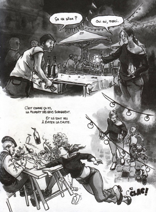 Chroniques de quartier, dans lequel le bar « Le Rallye » constitue un centre névralgique. Le dessin à l'encre est soigné, sans distinction majeure. Mais le découpage sans vignette, où dessins et textes flottent librement, permet à l'esprit de prendre des libertés de lecture. On s'attache aux personnages, malgré leurs travers. On ne comprend pas forcément ce qui mène à la fin mais ce n'est pas ça l'important.