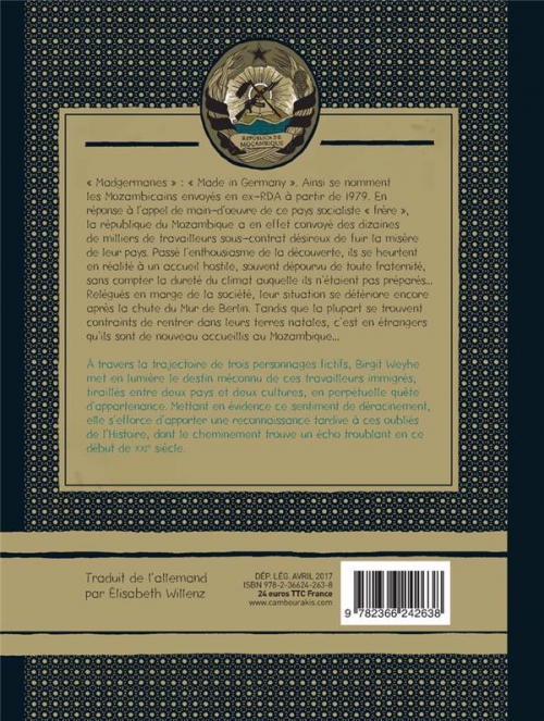1975. Après une longue lutte, le Mozambique obtient son indépendance et devient une République populaire dans la foulée. Si l’URSS est l’alliée de fait, de nombreux liens se forment également avec les autres pays frères, l’Allemagne de l’Est en particulier. En effet, entre cette date et la disparition du Rideau de fer, plus de vingt mille camarades venus du Sud vont émigrer en RDA. Sur le papier, il y est question d’entraide et de formation ; dans les faits, ceux-ci serviront surtout de main d’œuvre bon marché. De loin, ces hommes et ces femmes ne ressemblent qu’à une anecdote quasiment insignifiante de l’histoire du communisme. À y regarder de plus près, il s’agit d’une aventure incroyable, construite sur l’espérance d’une vie meilleure et vécue – vaincue – par la réalité.