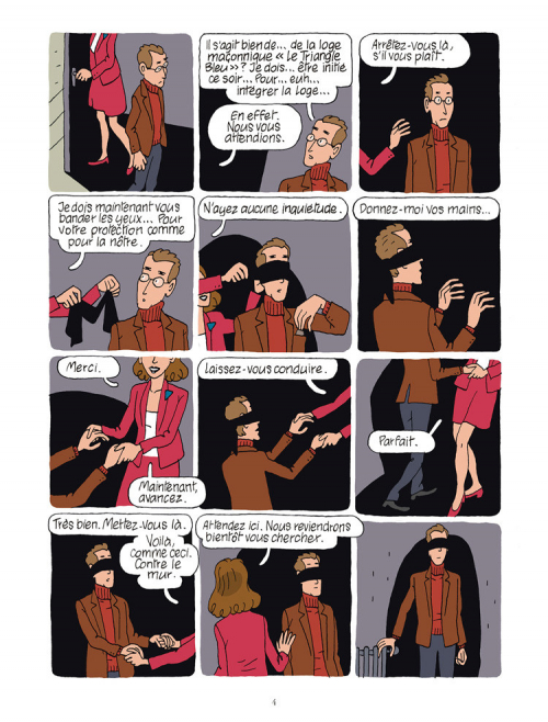 hilippe se rend rue Salomon, dans le XXe arrondissement de la capitale, là où loge le triangle bleu, un groupe de francs-maçons. Dès son arrivée, une hôtesse lui bande les yeux. Commence alors une attente prolongée. La désorganisation se révèle palpable : le vénérable est en retard, il manque d’épées et de chaises, puis il y a les muffins qui risquent de sécher. Cette première étape passée, l'initié fréquente pendant quelques années la célébrissime association. Les temps sont durs pour une entreprise dont l’aura s’étiole.
