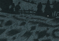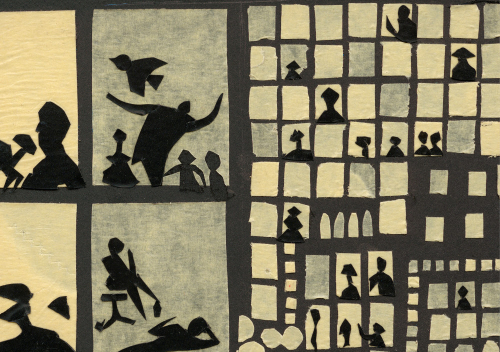Avec Lueurs, paru aux Éditions de la Cerise, Adrien Demont (Feu de paille, Buck), invite le bédéphile de tout âge à un voyage onirique et poétique sans parole qui se révèle de toute beauté. Dans l’écrin élégant d’un format à l’italienne, les planches dévoilent un travail minutieux à partir de collages, de découpages et d’incisions au scalpel de papier et de carton. Le résultat de cette partition graphique originale impressionne par son rendu qui accroche l’œil, son jeu avec la matière, les formes, les superpositions et avec les couleurs. Pour ces dernières, le noir et le bleu ont été privilégiés et font contraste ; toutefois, il s’y glisse aussi différentes nuances, notamment de gris, ainsi que l’explosion lumineuse d’inserts jaunes et blancs dont l’éclat augmente avec leurs chevauchements. Des détails sont ajoutés par de fines entailles ; celles-ci soulignent les traits et plis d’un visage, des angles ou des reliefs ou esquissent des mouvements, ce qui apportent du dynamisme à chaque page.