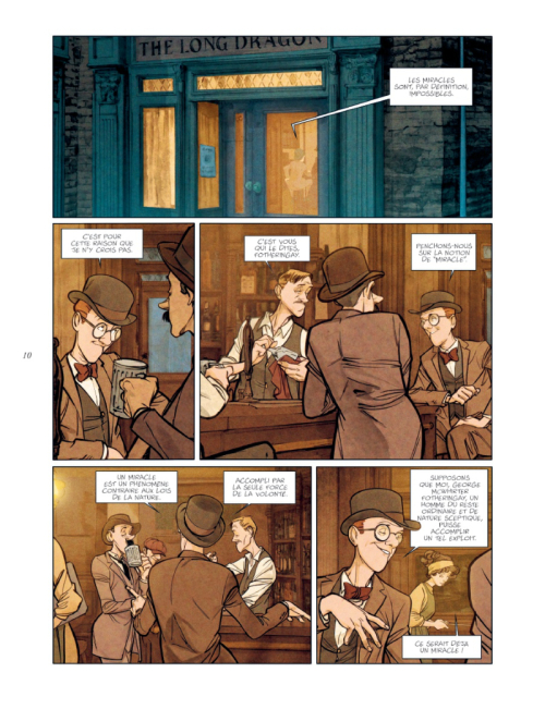 Le coup de pinceau, expressif et caricatural, souligne le burlesque des situations. Les comédiens, aux postures et mimiques exagérées, semblent d’ailleurs inspirés par le jeu des acteurs de films muets. Qui dit Londres dit brouillard ; les conditions climatiques dictent une atmosphère empreinte de mystère, avec une touche d’onirisme. Aussi, impossible de passer sous silence le travail de colorisation réalisé par Sedyas, notamment ses clairs-obscurs, lesquels accentuent l’étrangeté de cette fable éclairée par les lampes au gaz. L’impression sur papier mat donne du reste une agréable profondeur au dessin.