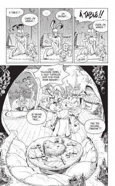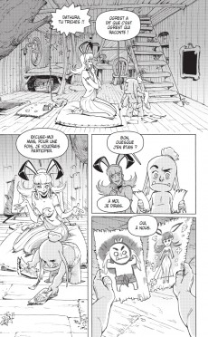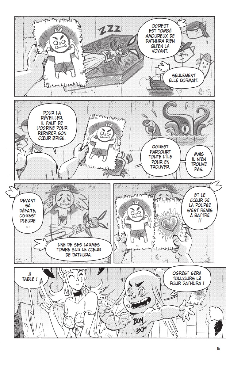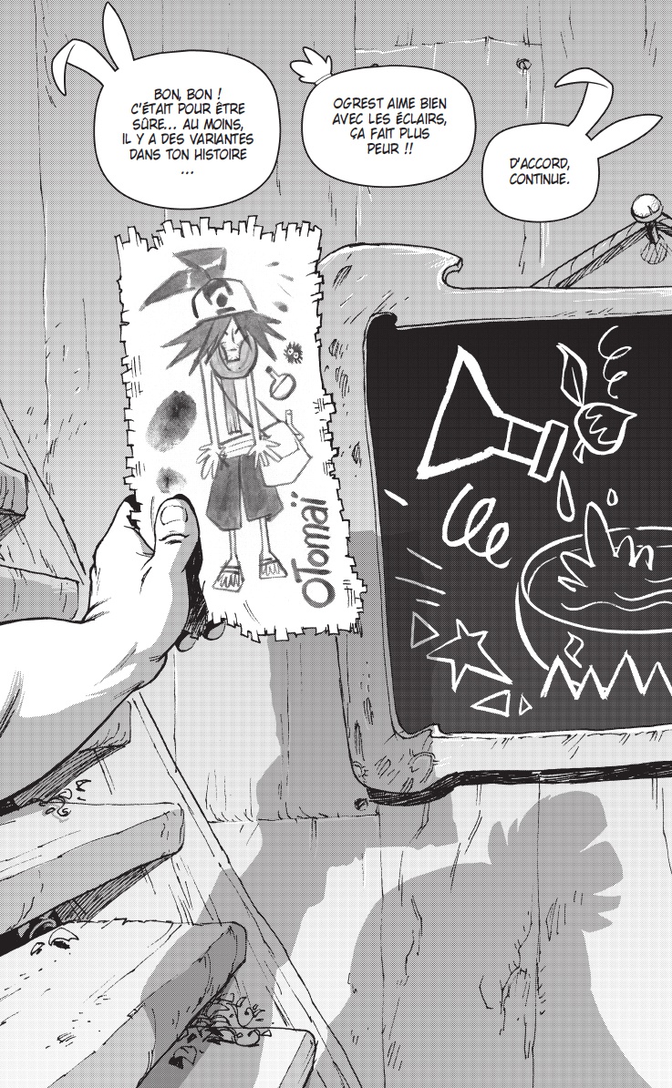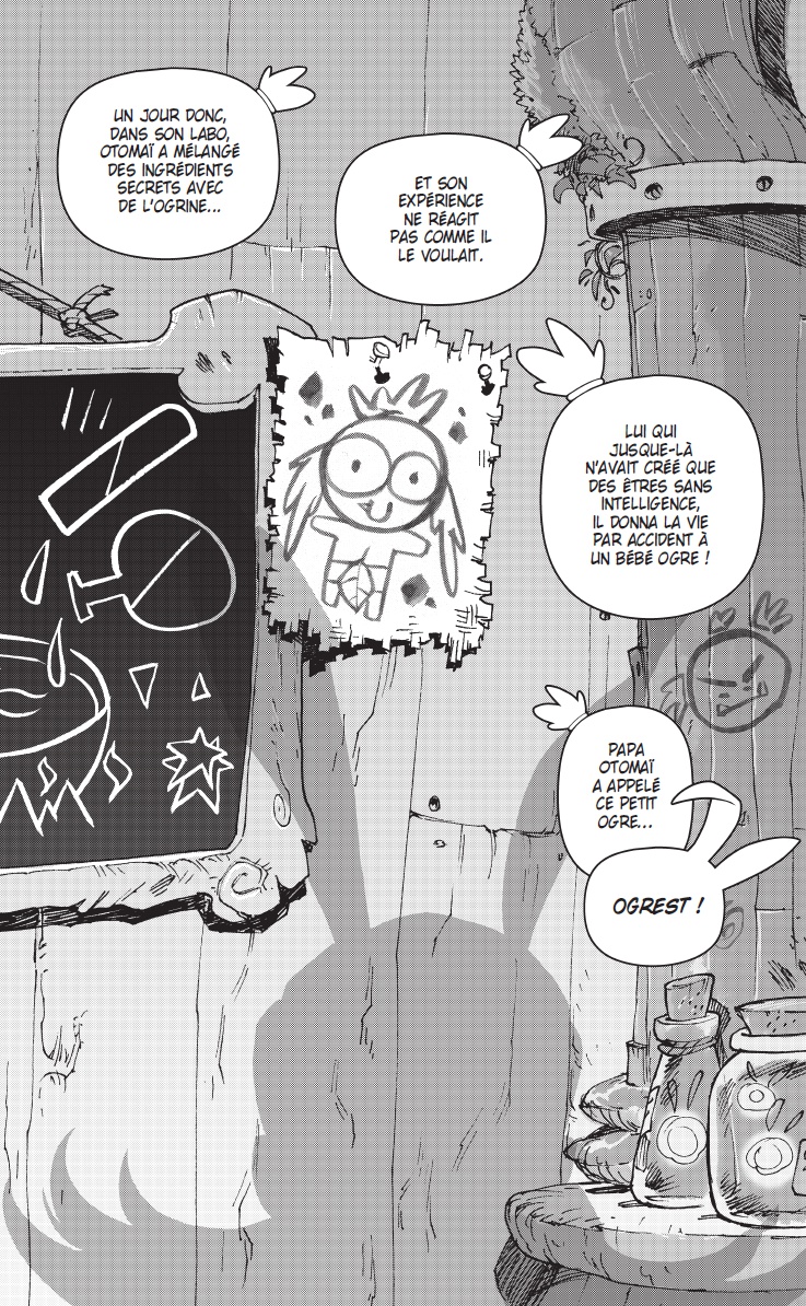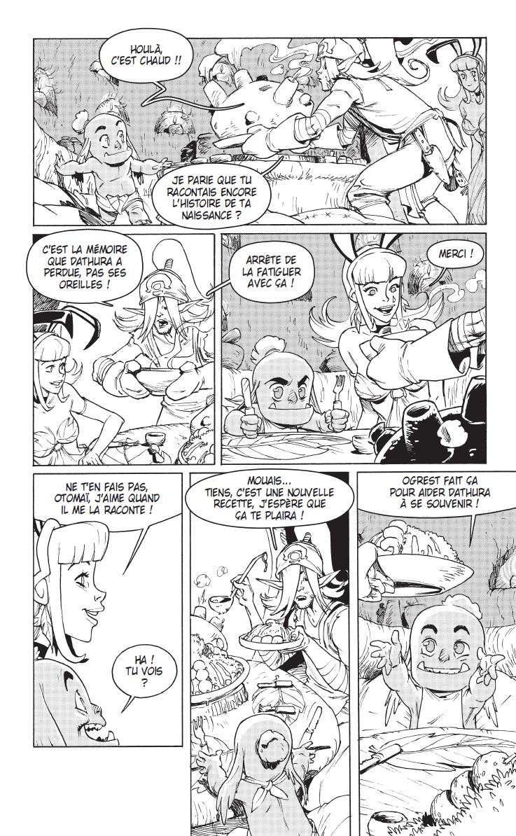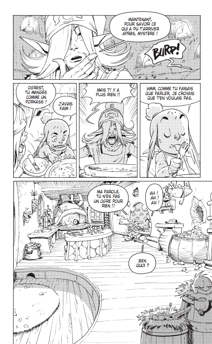 Les contraintes sont établies par l’Époque, le Genre et tout ce qui a pu être écrit avant. Comme pour beaucoup d’univers (Star Wars, Marvel, D.C… ), il y a un temps d’adaptation pour bien intégrer le « background », et surtout bien comprendre le ton employé, l’esprit « Ankama » et « Dofus ». Le fait d’avoir longtemps travaillé sur différentes licences (Astérix, Lucky Luke pour les produits dérivés ; Winnie l’ourson, Pingu, Babar pour l’édition et la BD) m’a permis de savoir comment aborder rapidement un nouvel univers. Je travaille en collaboration avec l’éditrice Elise Storme, qui gère un bon nombre de titres chez Ankama éditions, et notamment les BD et manga du « Krosmoz ». Elle a une vision d’ensemble et me sert très souvent de garde-fou. J’ai écrit Ogrest en la consultant très régulièrement, en lui faisant part de toutes mes idées. Cela me permet de tester le développement de mes personnages, de mes gags et de mes intrigues. J’ai exposé les premières versions de mon histoire à Tot. Comme il a toujours un milliard d’idées en tête et autant de projets en cours, c’est très important pour moi de connaitre toutes les affiliations possibles entre les titres. Nous avons beaucoup discuté des personnages, de leur devenir, de leurs envies. Les deux m’ont apporté des idées me permettant de débloquer certains passages biscornus. Il est important de souligner que, contrairement à bon nombre de licences, le dessinateur amène son point de vue et son interprétation de l’univers chez Ankama. J’ai pu travailler dans un style plus personnel que dans mes premières séries. Et comme j’y travaille depuis plus de 6 ans, j’ai eu le temps de bien m’imprégner. L’univers mis en place m’a servi de prétexte pour écrire des choses plus personnelles, que j’avais envie de raconter et de partager.