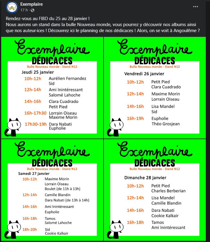 Possibilité d'avoir les horaires des auteurs Lombard en passant par le site du FIBD 51e édition/Programmation/Auteurs Autrices et après il faut taper le nom de chacun-e... Bon courage.