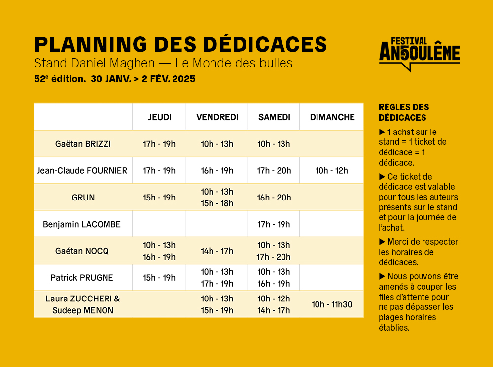 tanuki a écrit:Ceci dit le programme a été mis en ligne vendredi et il montre les éditeurs et les stands dans les Bulles.