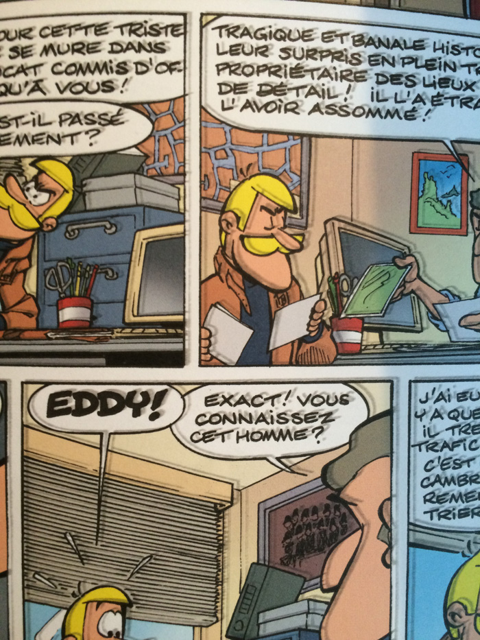 Pour en revenir a cet album, le moins que l'on puisse dire est que Turk n'a rien perdu de son talent a dessiner des decors contemporains apres cette si longue interruption durant laquelle il s'est consacre a Robin Dubois (un peu) et Leonard (surtout). En fait, ce que j'y prefere, c'est la maniere dont il dessine les voitures. Il les dessine aussi bien que Franquin, Jidehem, Tillieux, Denayer et Martin. On sent qu'il aime. Je me souviens d'ailleurs qu'il avait declare lors d'une interview qu'il adorait les decapotables anglaises. Le scenario de Zidrou lui a permis de satsifaire ses envies, c'est un veritable festival de diverses carrosseries qu'il offre a ses lecteurs; la MG du heros, une jolie Jaguar XK des annnes 50, une Rolls-Royce Silver Cloud, une Ford Cortina, une Citroen DS. Pour moi, ce sont des voitures que je voyais dans les rues a une epoque ou les voitures ne se ressemblaient pas toutes et etaient facilement identifiables. C'etait notre minute nostalgique. La seule chose qui m'a desagreablement surpris est dans la calligraphie des differentes enseignes publicitaires et du nom du bateau que l'on voit au debut et a la fin de l'histoire ou Turk a manifestement utilise un ordinateur pour les ecrire. Je prefere quand tout est dessine, comme il le faisait avant.