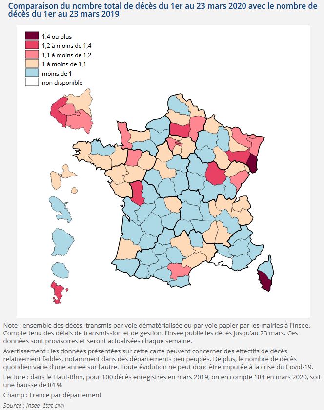 RosbOOm a écrit:Ca varie beaucoup selon les départements, on voit clairement la surmortalité dans le Haut Rhin, la Corse du Sud et l'Oise.