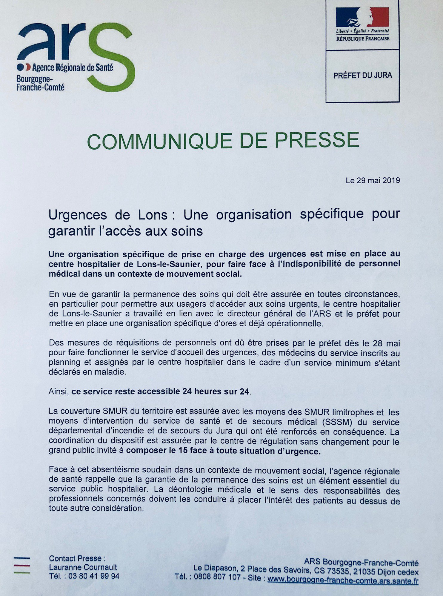 Aux urgences de Lons-le-Saunier, 70 % du personnel est en arrêt maladie, épuisé. Pour assurer la continuité des soins, les autorités réquisitionnent le personnel médical avec l’appui des forces de l’ordre, pour ce week-end de l'Ascension.