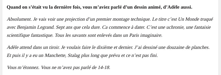 NARCISSE a écrit:the frog a écrit:NARCISSE a écrit:on sait qu il y aura une suite et ce sera le tome final de la saga Adele blanc sec. Depuis vingt ans, on va dire qu adele blanc sec n est pas sa priorité, et on peut le comprendre.